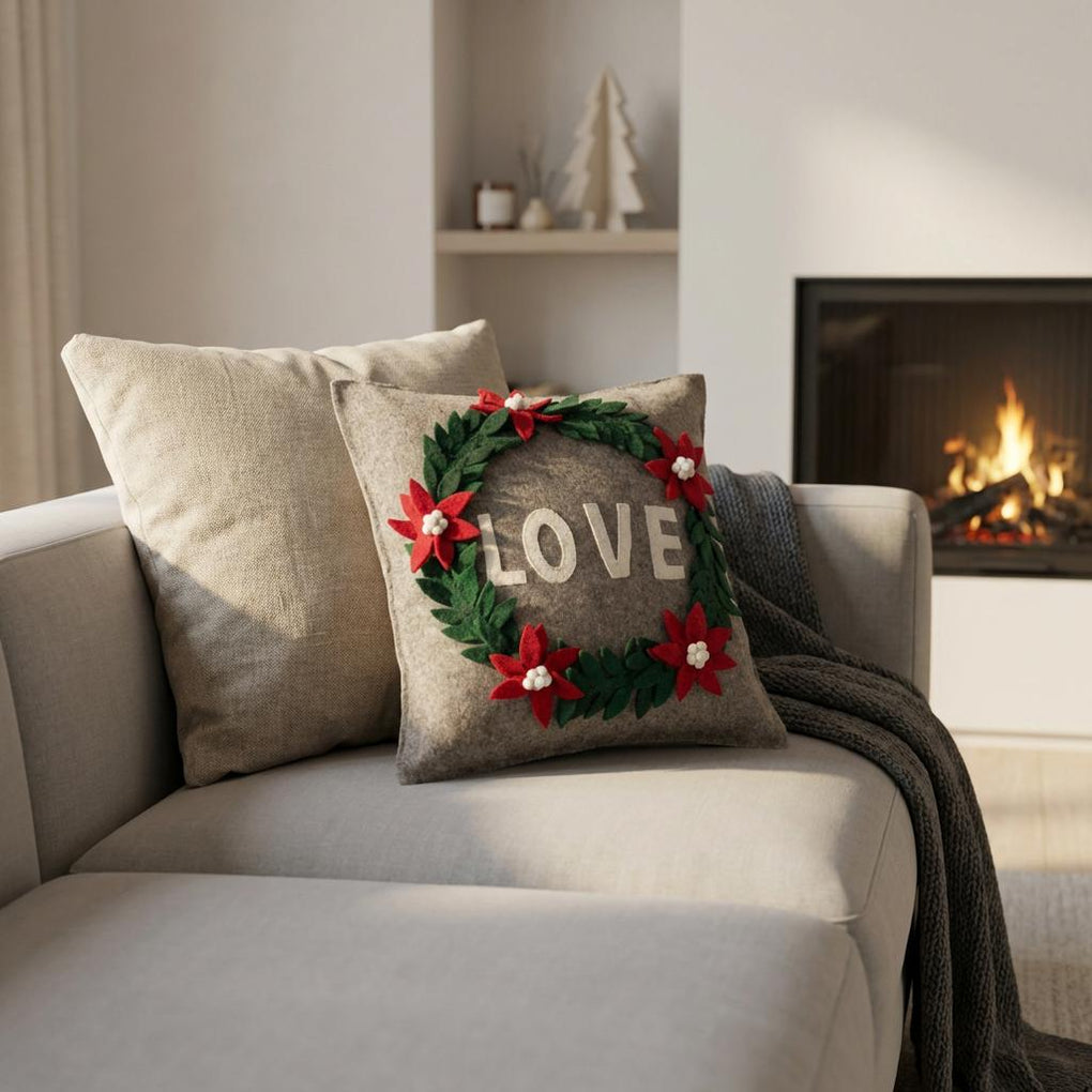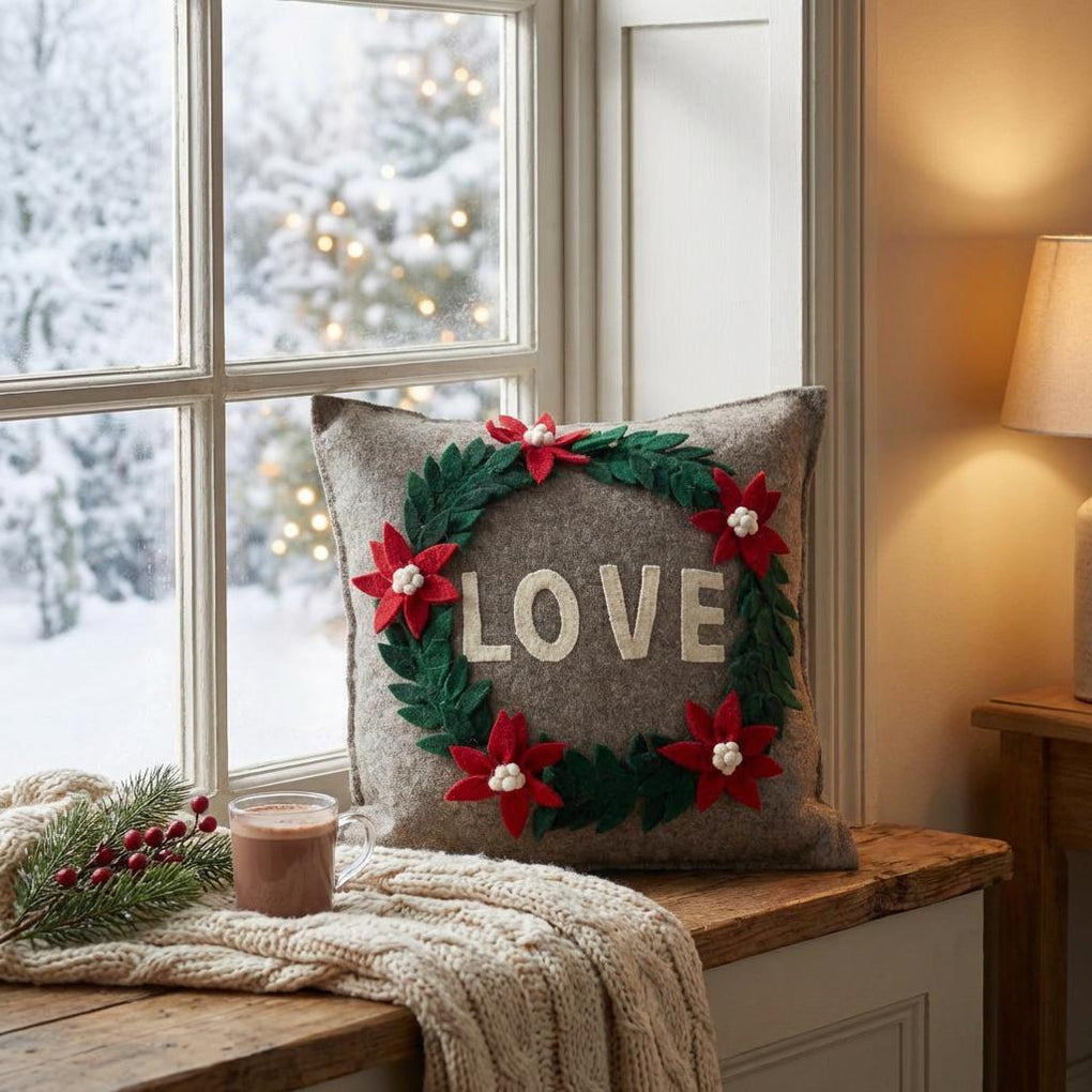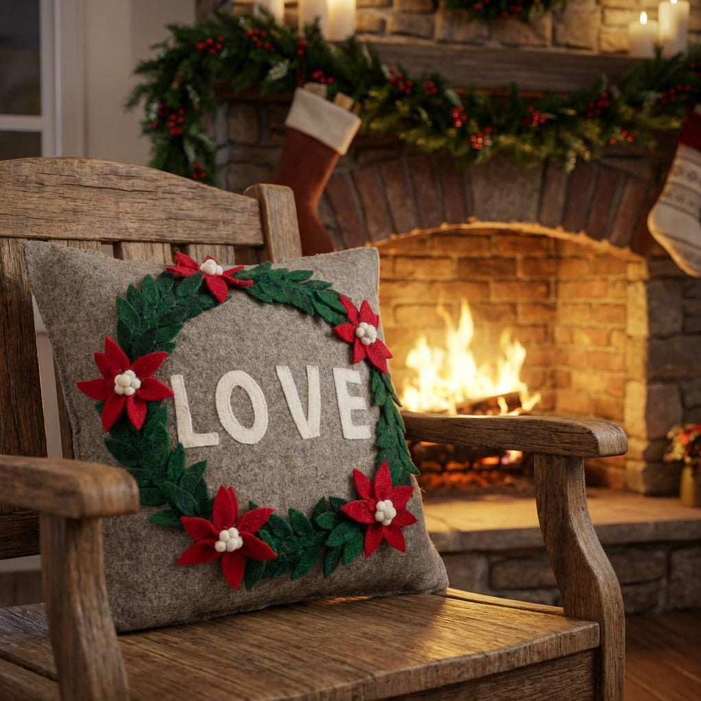 This pillow, with the word LOVE framed in a lovely wreath of poinsettias and green leaves, will add good cheer and elegance to your holiday festivities.