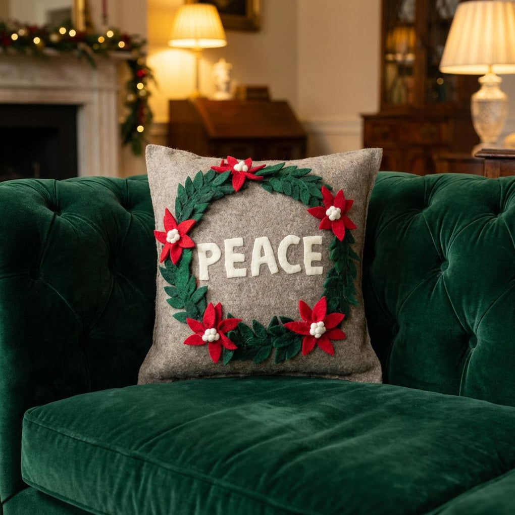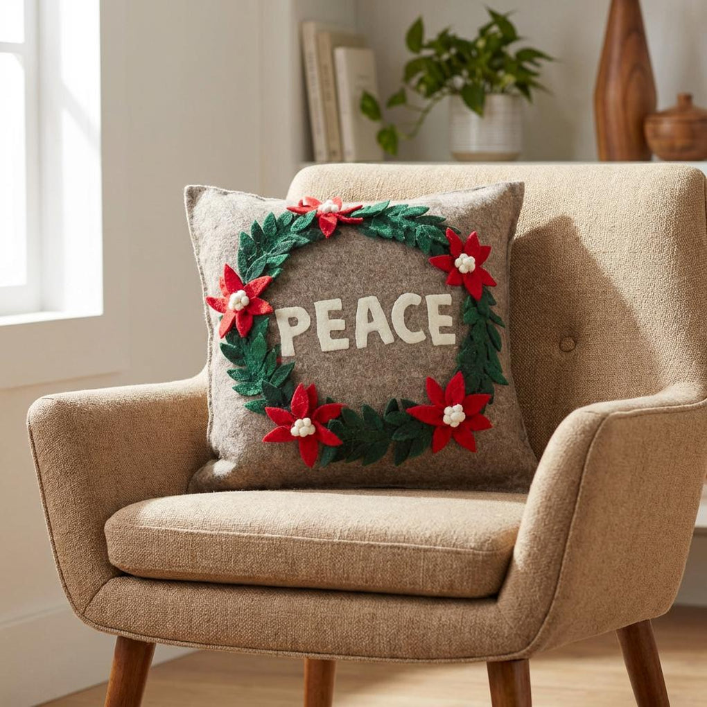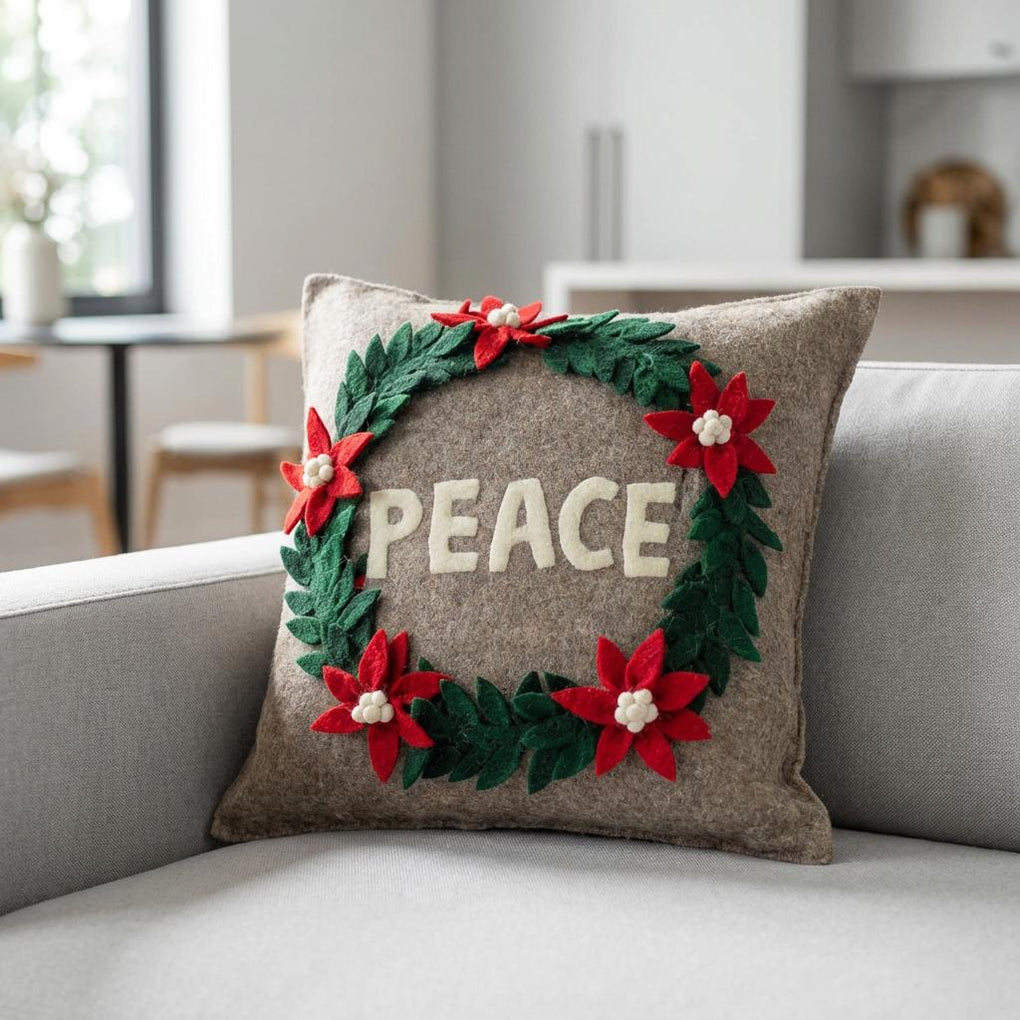 This pillow, with the word PEACE framed in a lovely wreath of poinsettias and green leaves, will show all your wishes for this season. Hand felted and hand appliqued in 100% sustainable wool felt.