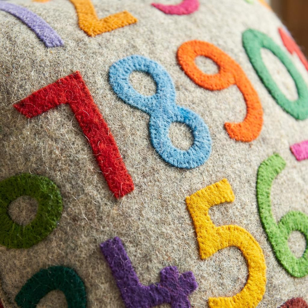 The digits seem to dance on this colorful pillow cover! Perfect for little ones learning to count. Hand felted and hand appliqued in 100% sustainable wool felt.