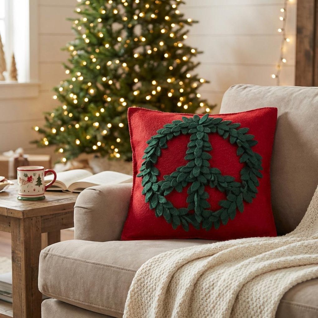 This pillow features the iconic peace symbol formed by lovely green leaves against a red background.