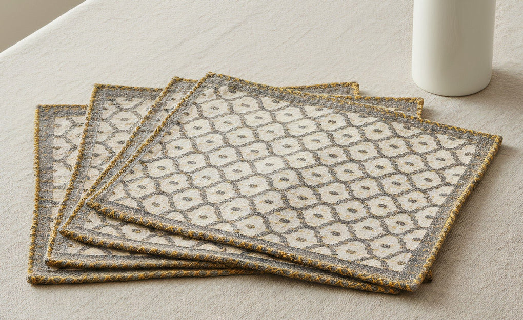 Artisan Hand Loomed Placemat - Gray with Yellow Stitching - 14" x 19"- Set of 4