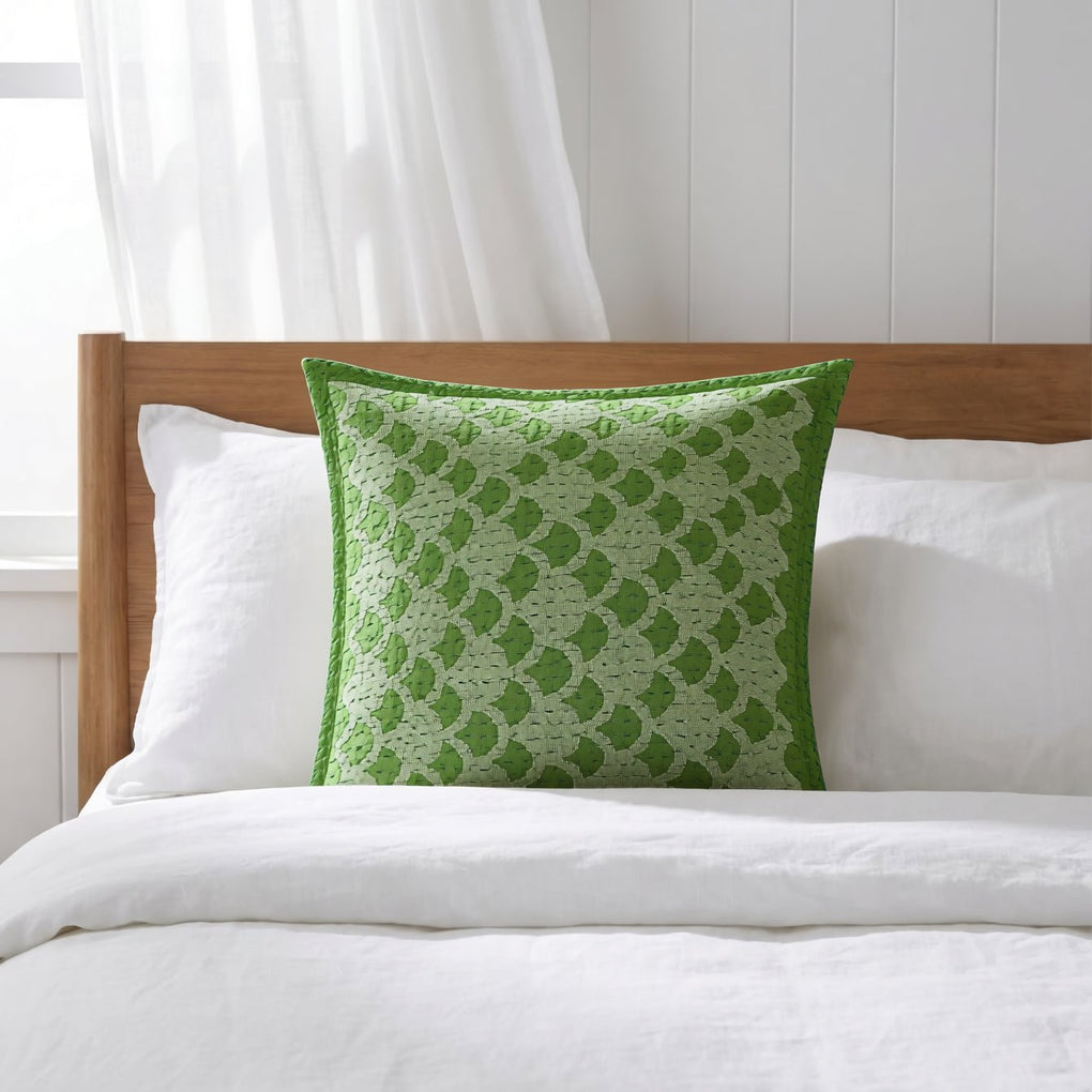 This beautifully handcrafted pillow adds luxurious texture and style to bedrooms, living rooms, and reading nooks. The green ginkgo pattern is handloomed and finished with matching kantha stitching. The back side made of natural color cotton.