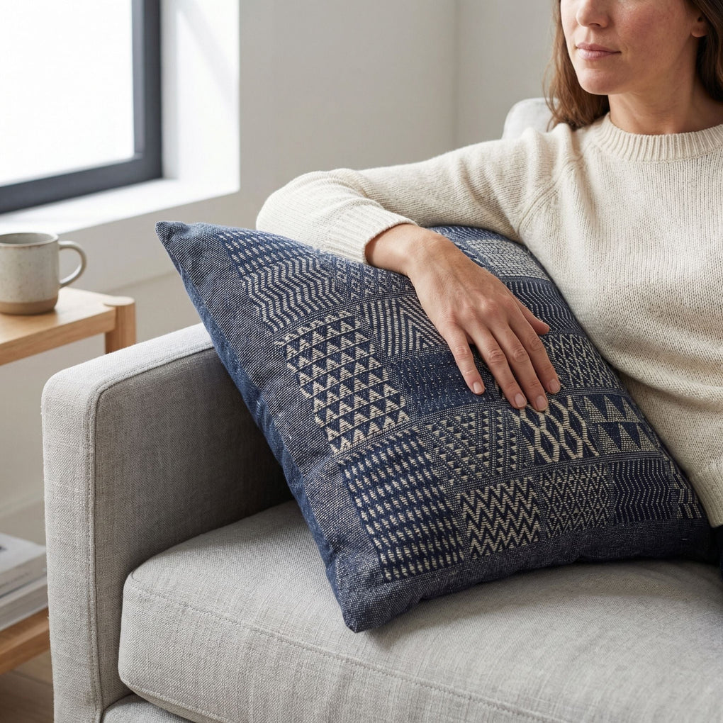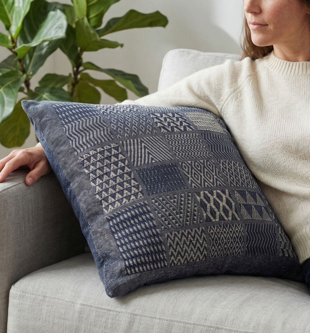 Artisan Hand Loomed Cotton Square Pillow - Indigo Blocks - 24"