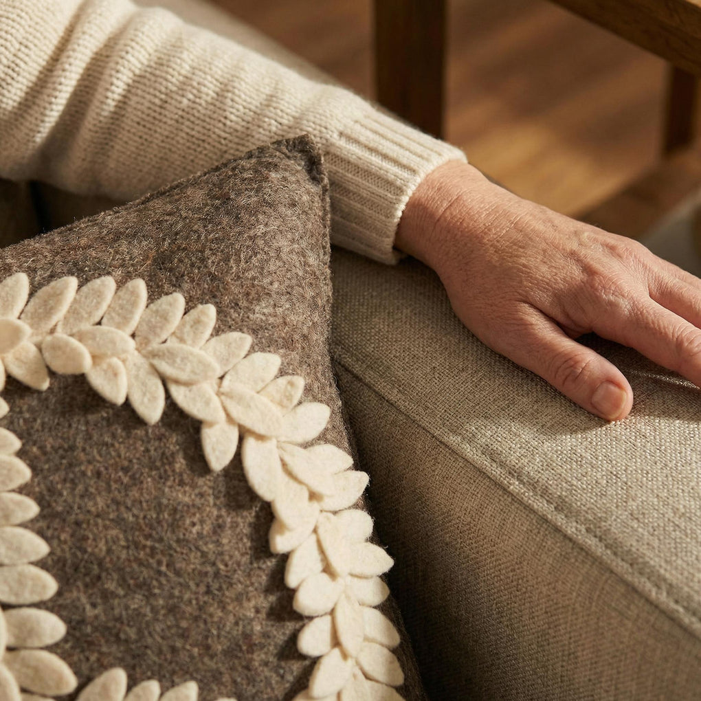 Arcadia Home felt designs are hand-felted, hand-appliqued, and lovingly created from 100% sustainable wool by artisans working in India. The facility where these pieces are produced is an award-winning model of sustainability, which runs on solar electricity, collects rainwater, and recycles water on-site. By collaborating with this artisan group, Arcadia Home is helping to preserve the tradition of felt-making in the area, promote eco-friendly business, and provide fair and safe employment for hundreds of artisan felt-makers, sheepherders, and seamstresses.