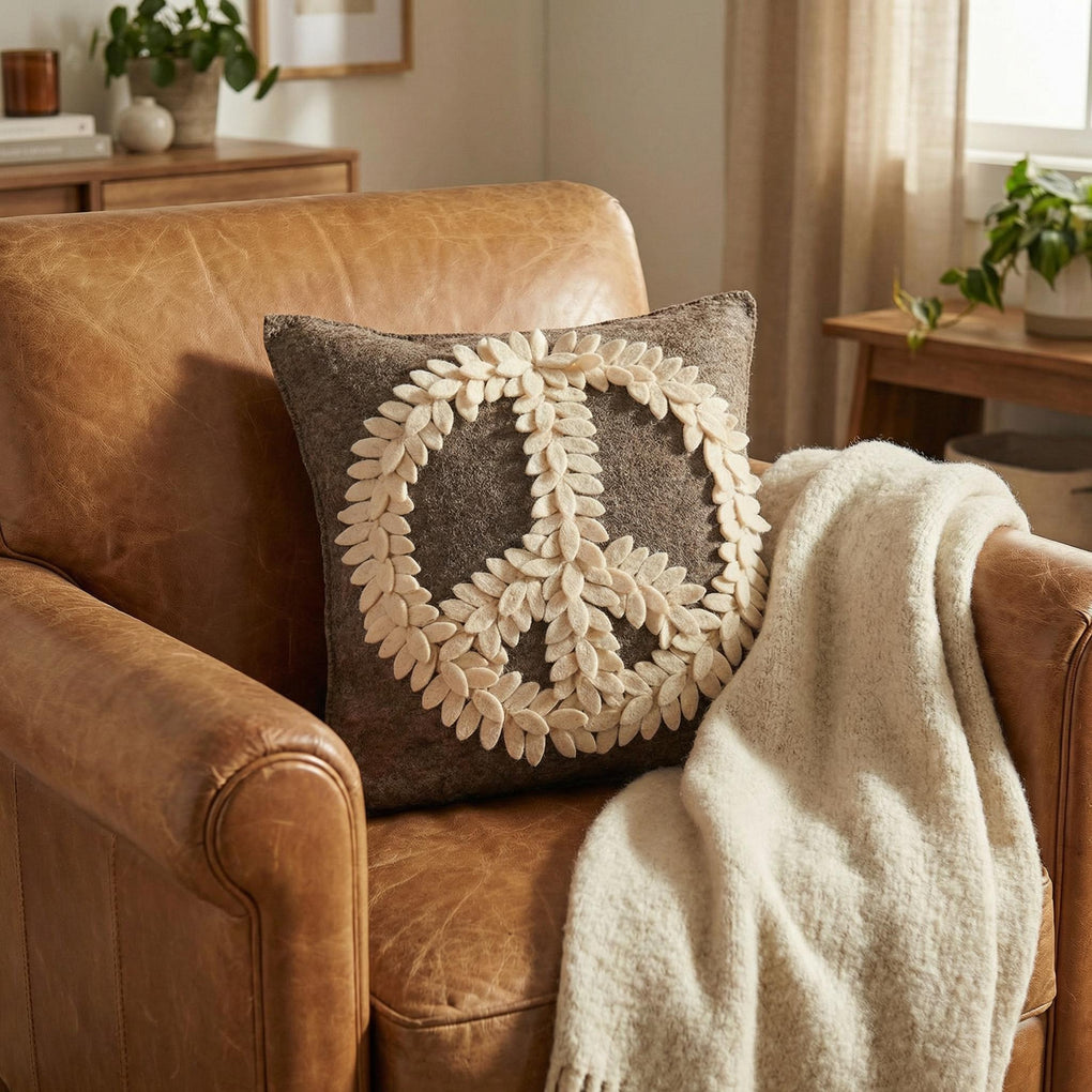 This pillow cover features the iconic peace symbol formed by lovely cream leaves against a gray background.