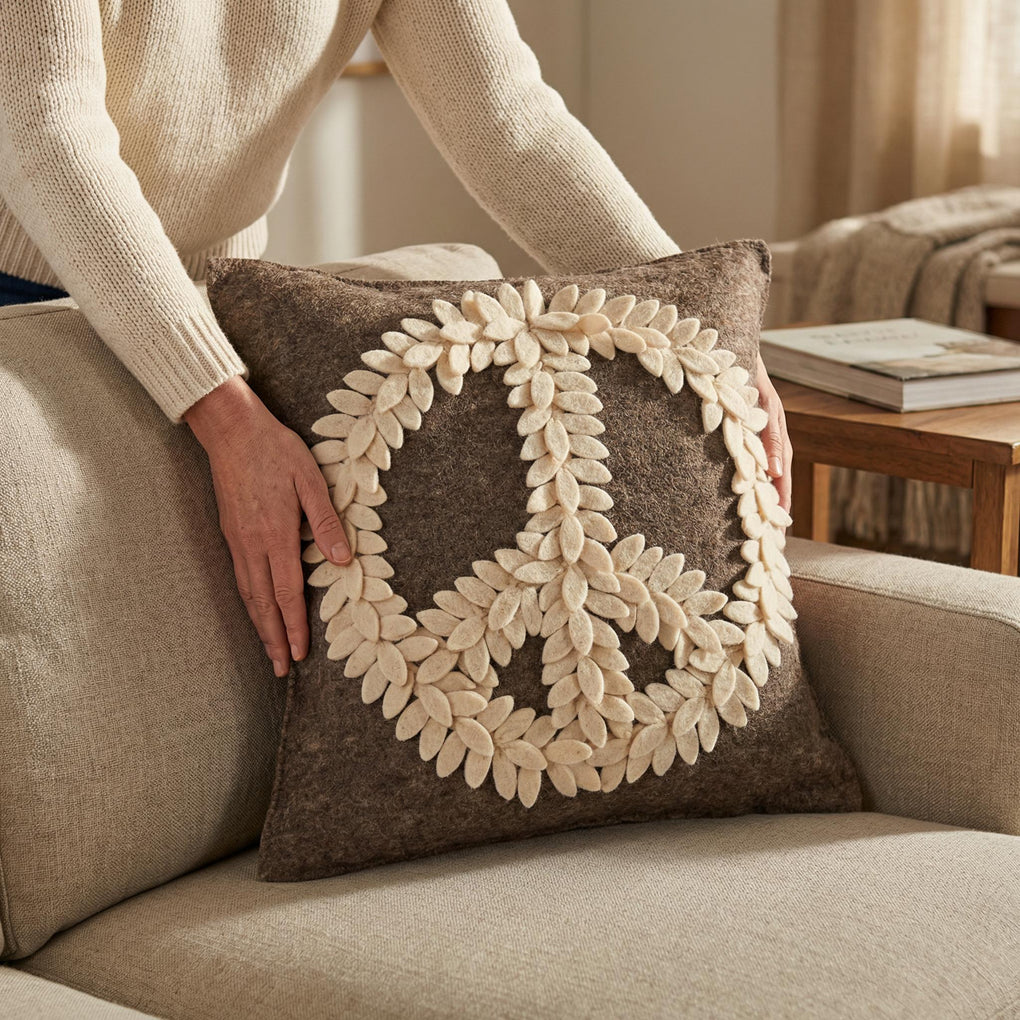 Hand Felted Wool Pillow Cover, Cream Peace Sign on Gray‚ 20"